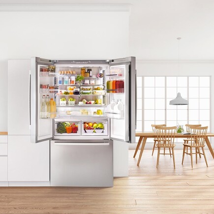 Die andere Option wäre ein French-Door-Kühlschrank. Im Unterschied zum Side-by-Side-Modell befindet sich hinter den Doppeltüren ein durchgängiger Innenraum. Vorteil ist hier, dass mehr Platz in der Breite zur Verfügung steht, sodass z.B. problemlos ein Backblech hineinpasst. Der Gefrierbereich befindet sich als großer Auszug darunter.